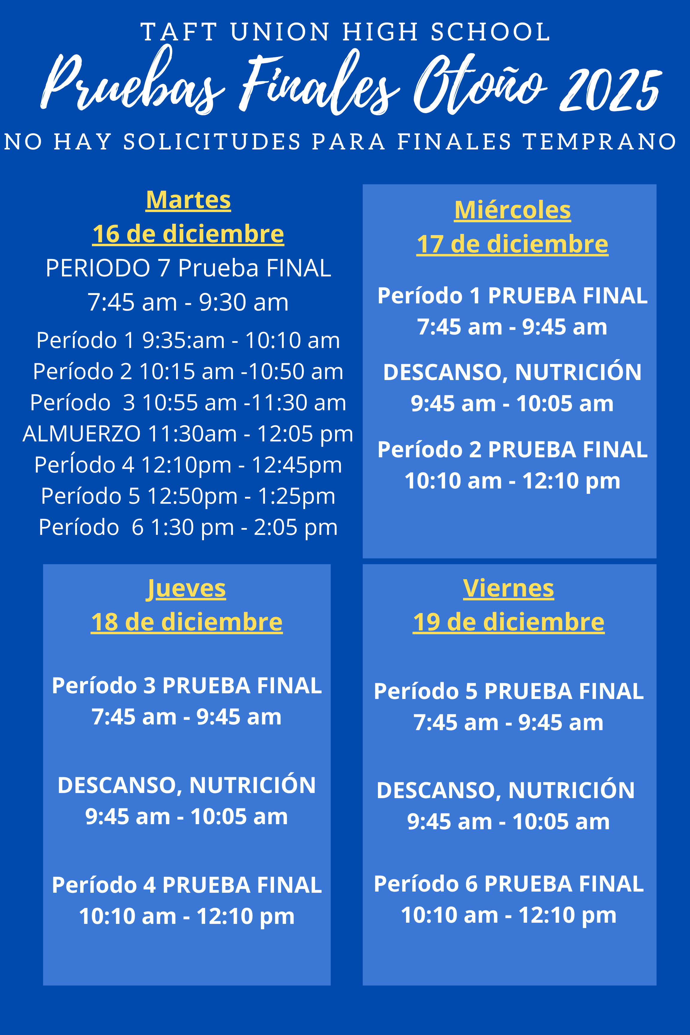 This morning we being our 7th period final. The remainder of the day is the final opportunity for students to meet with their teachers before the rest of their finals over the next 4 days. Thank you for helping us prioritize this academic atmosphere and encouraging your students to do their best. During finals week all absences must be excused should a make-up final be requested when we return in January. Should your student need to be picked up early for any reason, please plan on coming to campus to request your off campus pass directly from switchboard. Have a wonderful week!